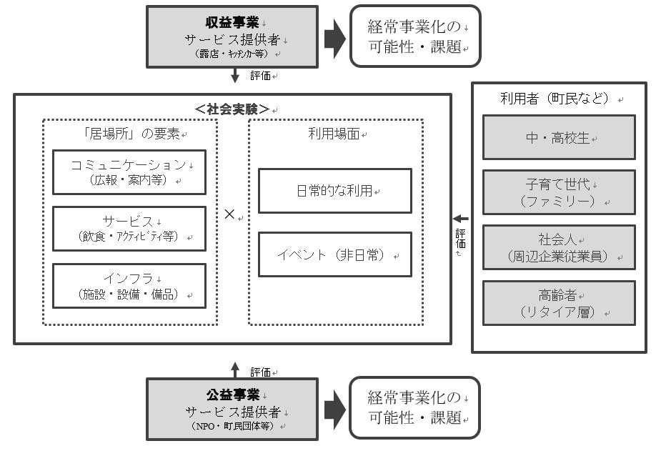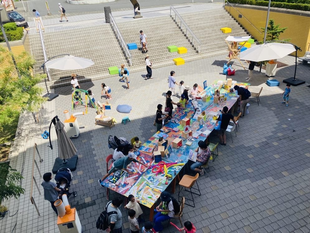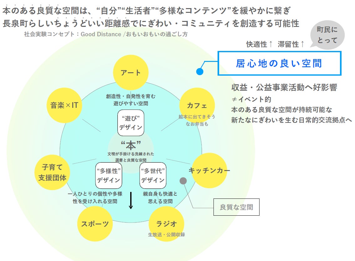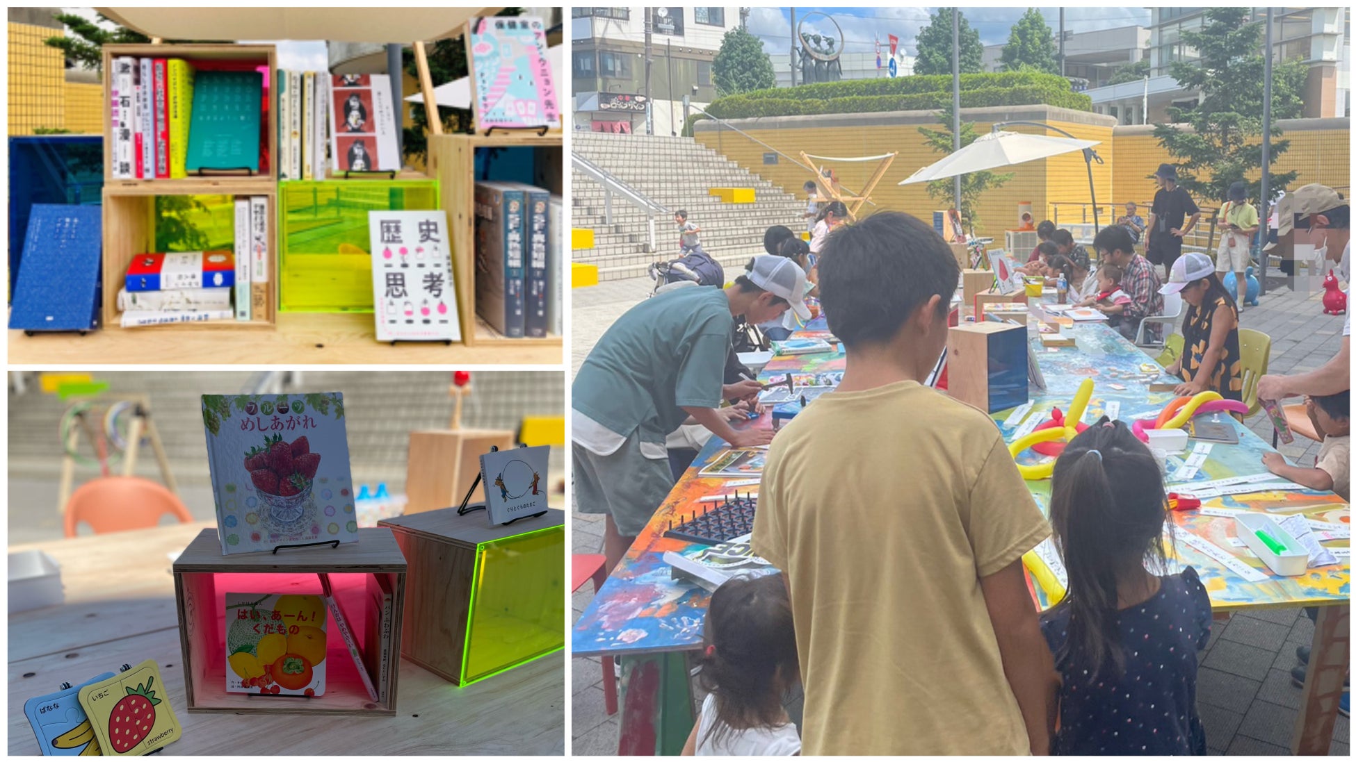 今回の社会実験は、駅周辺のにぎわい創出を目的に実施したものです。一過性のイベントではなく、持続可能な日常的なにぎわいの創出に向け、「本」を柱とした良質な空間を提供し、子育て世帯を中心とした多世代の人の流れや過ごし方を調査し、町民に加え、参画した民間事業者・公益事業者にもヒアリングを行い、新たなコミセン駅前広場の活用方法を検討するものです。また「本」を柱とした良質な空間が多様なコンテンツ(食・スポーツ・文化・芸術等)をどの程度繋ぎ、組み合わさり、相乗効果を生むのかもあわせて検証要素とし、今後のマチづくりに活かすことを目的としました。