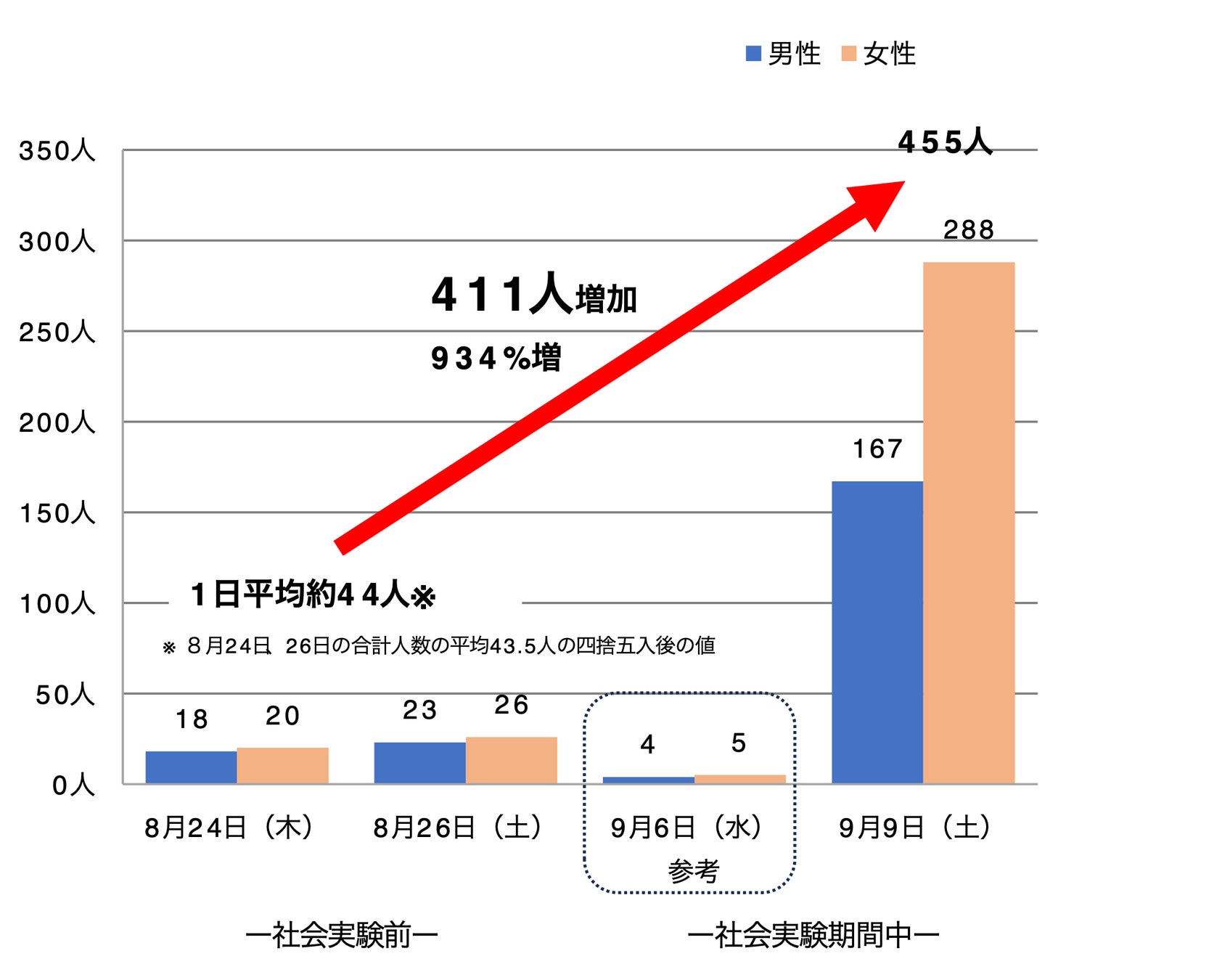 ※実験前の2日間(8月24日(木)、26日(土))平均44人→9月9日(土)の社会実験日455人