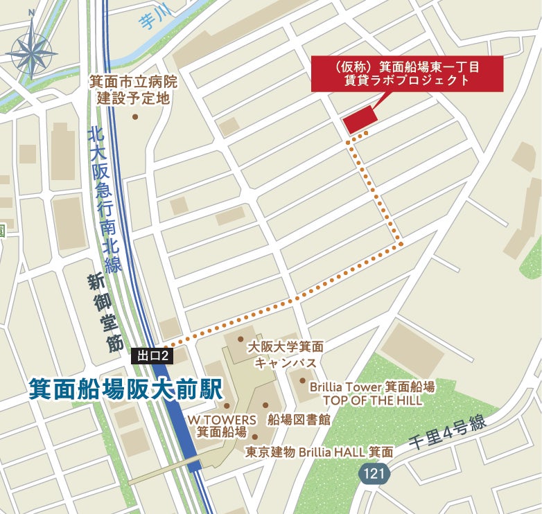 本物件は箕面船場エリア東部、「箕面船場阪大前」駅より徒歩約8分に位置し、ライフサイエンス分野の研究が盛んな大阪大学吹田キャンパスへのアクセスも優れた立地です。