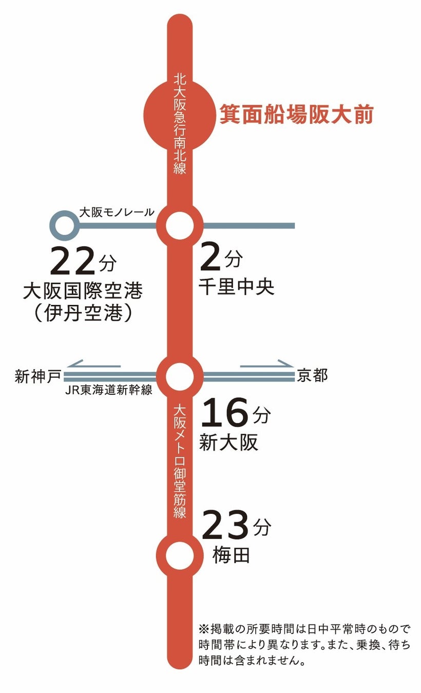 箕面船場エリアは、昭和40年代に土地区画整理事業によって基盤整備され、大阪船場繊維卸商団地として主に流通・業務系の土地利用を中心に発展してきました。2024年3月には北大阪急行線(大阪メトロ御堂筋線直通)の延伸が実現し、「箕面船場阪大前」駅周辺では住宅・商業施設や劇場等の複合開発を含めた新たなまちづくりが進行しています。「箕面船場阪大前」駅から「新大阪」駅まで約16分、「梅田」駅まで約23分、「大阪空港」駅まで約22分(「千里中央」駅で大阪モノレールに乗り換え)と大阪市内はもとより、日本全国への交通利便性に優れたエリアです。