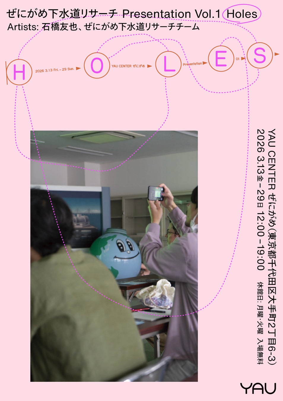 4年目となるYAU OPEN STUDIO ’26 では、東京都下水道局と連携し、都市の細部にまで張り巡らされ、生活に欠かせないライフラインをリサーチする、《ぜにがめ下水道リサーチ Presentation vol.1「Holes」》のほか、編み物という身体的行為や生産プロセスをもとに都市に創造的な介入を試みるTALK NONSENSEのプロジェクト《都市を編み直す》の展示/ワークショップ、街角に設置した公衆電話を通じて、誰かが日常の中で抱いた違和感を聞き、応答することを通して、他者の違和感を「預かる」、全人類問い持ちプロジェクトによる参加型のアートプロジェクト《違和感預かり所》など、地区で活動をしてきた3組のアーティストの成果を発表。また、ワークショップやトークイベントなど、アートを媒介に大丸有地区を体感するプログラムが集結します。