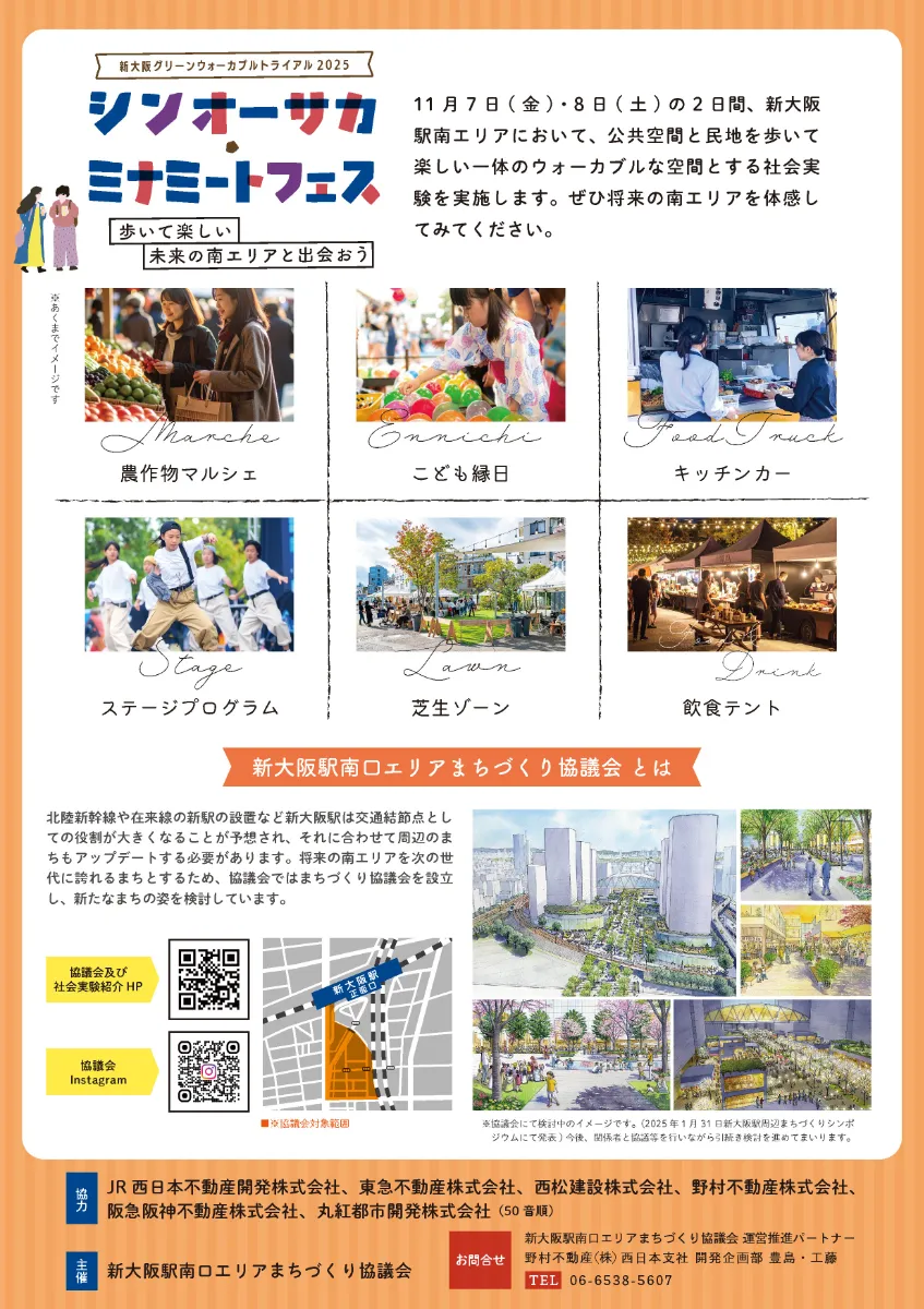本協議会は、取組の一環として、新大阪駅南口エリア一帯で『シンオーサカ・ミナミ―トフェス -歩いて楽しい未来の南口と出会おう-』を11月7日(金)、8日(土)に実施いたします。
