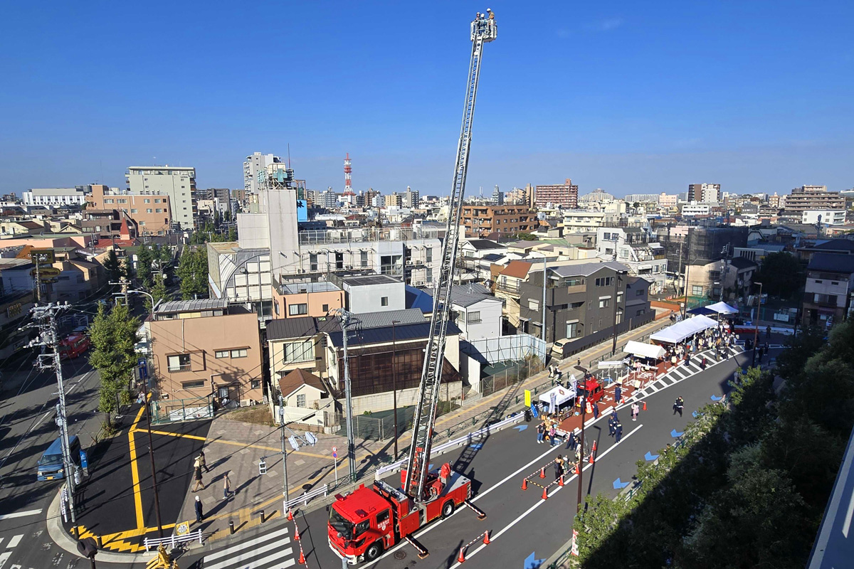 王子消防署から出動したはしご車の搭乗体験には多くの申し込みがあり、抽選での搭乗者選出となりました。搭乗者は、一般的な建物の10階部分に到達するほど高く伸びるはしごに驚きつつ、高所での救助・消火活動の頼もしい対応力を身をもって感じているようでした。