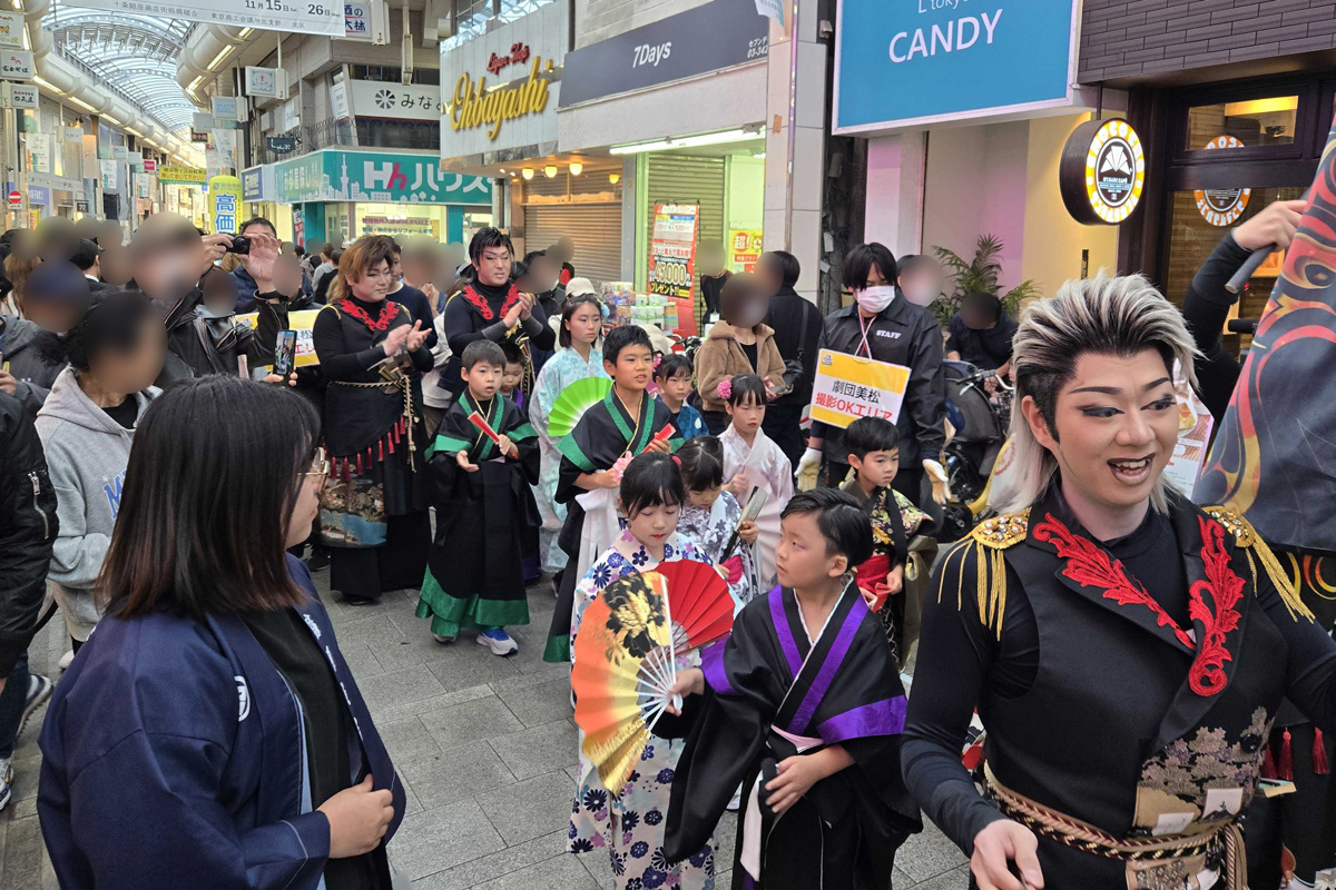 中十条2丁目にある都内最古の大衆演劇場「篠原演芸場」からは地元小学生も参加する着物パレードが出発。「劇団美松」の役者さんを先頭に、美しい着物をまとった禿(かむろ)姿の小学生が商店街を抜けて駅前広場までの約400mを練り歩きました。